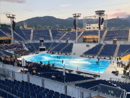 The product was co-developed with Alabama, which supplied all video equipment for the arena. As well as covering almost the entire floor area with outdoor LED, the company supplied 150 sqm of Absen AT5 Pro outdoor LED screens in the form of columns at the top of four stages; provided a visual technical control system based around Barco’s E2 system and several Smode media servers; and installed a camera system and return monitoring to ensure a smooth running show was delivered to all screens.