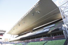 The first phase of modernization of the stadium within the west and south grandstands has been completed recently with a new sound system based on RCF P Series speakers. All P 6215 are suspended to the roof of the stadium coupled in vertical clusters, two speakers per cluster.