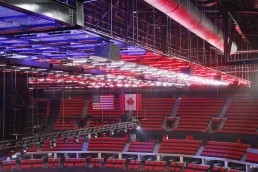 The client wanted the arena bowl to be covered by a solid ceiling, rather than the typical black void of most arenas, but with challenges like HVAC and rigging to contend with, not to mention cost concerns, the solution wasn’t easy to find. The answer came in the form of SkyDeck, a tension wire grid system created by InterAmerica Stage. The open wire covering acts as a scrim over the bowl, a modular ceiling that can be reconfigured for any event. Keith Irtenkauf of Illuminating Concepts calls it a “functional solution to an aesthetic problem and a solution that worked well.”